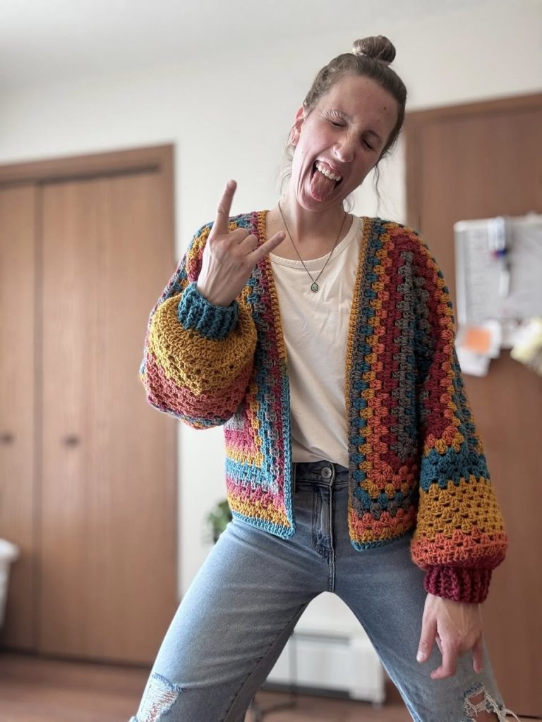 This cardigan is also a great stash-buster. You can use leftover skeins in playful stripes, or keep it more curated with a planned palette. The texture comes from classic granny clusters, which means the fabric is warm but still drapes nicely.