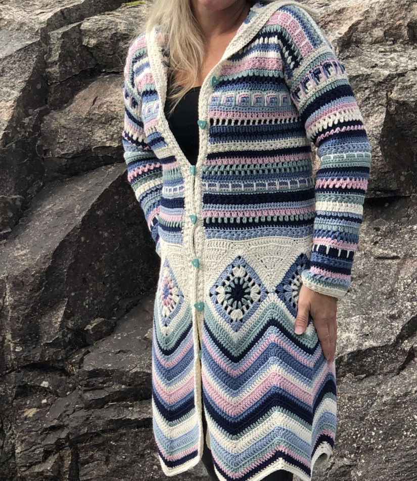 Crochet cardigans are a timeless expression of creativity, comfort, and personal style. Unlike store-bought garments, handmade crochet clothing carries the beauty of craftsmanship and individuality. This cardigan combines stripes, chevron textures, and granny squares, creating a piece that feels both modern and nostalgic. It’s perfect for layering and versatile enough to wear in any season.
